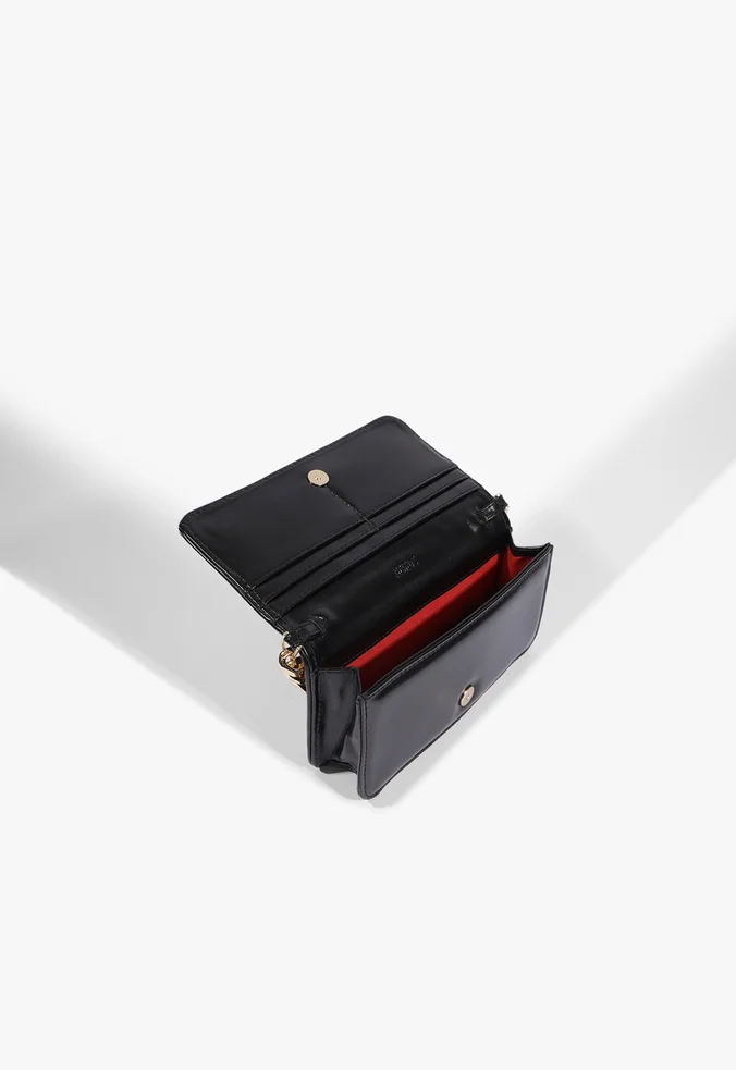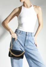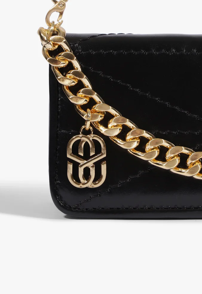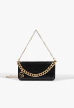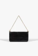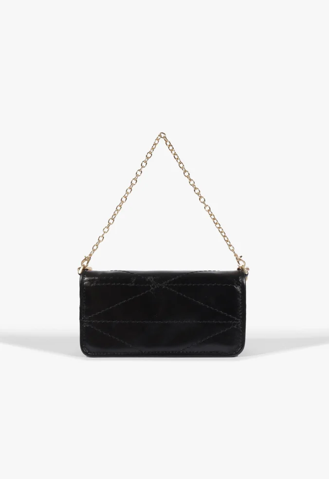 Apresentamos a mini bolsa tiracolo Mika, a combinação perfeita de sofisticação e praticidade em um formato compacto e estiloso. Confeccionada em um material preto brilhante com um elegante padrão matelassê, esta pequena notável é acentuada por uma marcante alça de corrente dourada, que adiciona um toque de glamour instantâneo a qualquer look.