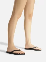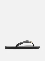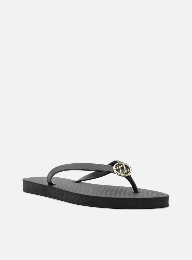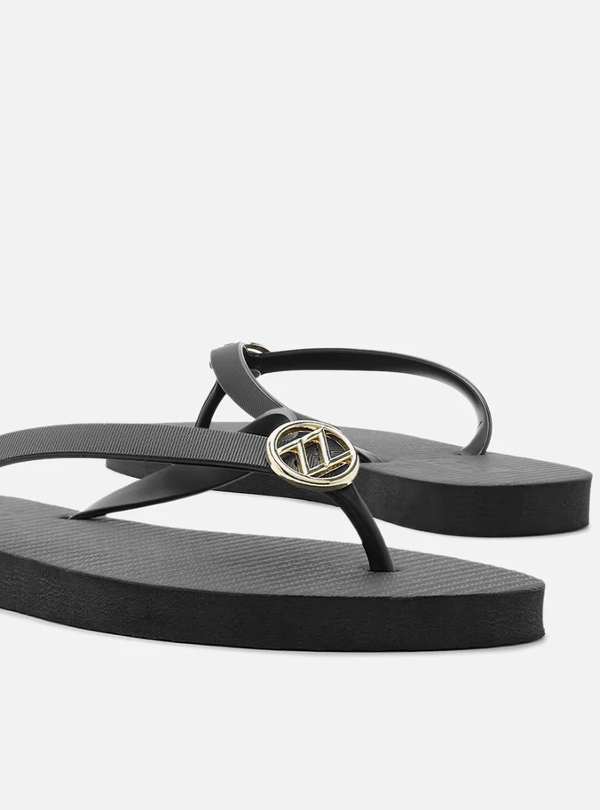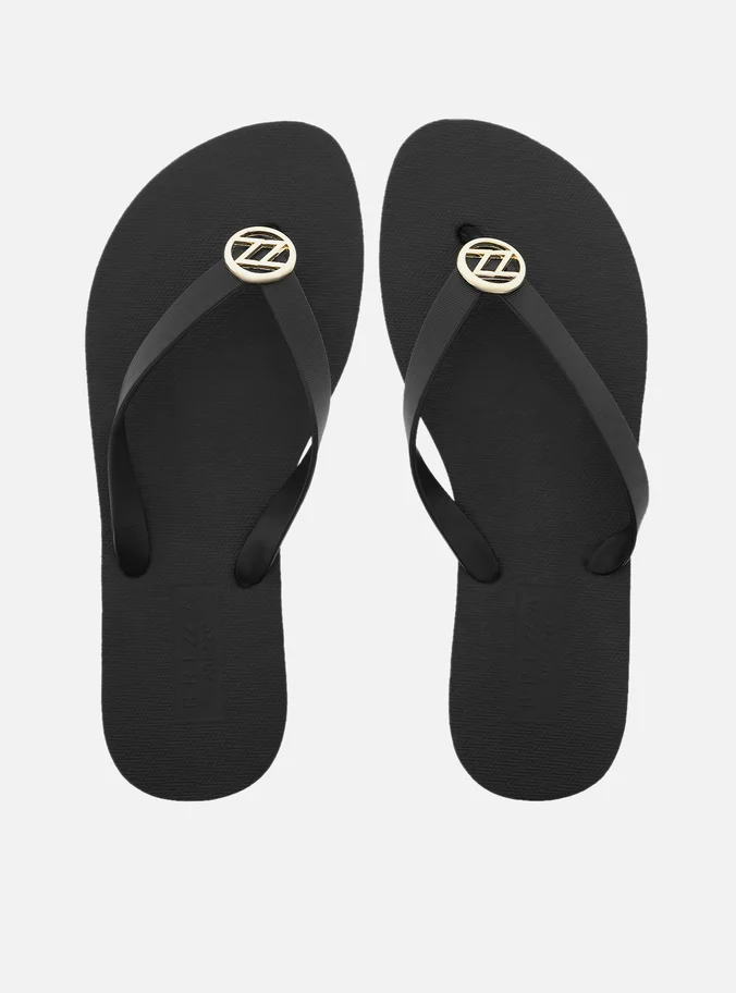 Chinelo feminino preto. O sapato tem sola rasteira flat emborrachada e palmilha texturizada com nome da marca. Com formato arredondado na ponta, traz tiras finas injetadas, dividindo os dedos, com aplicação metálica vazada ZZ no centro.