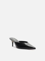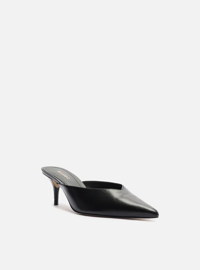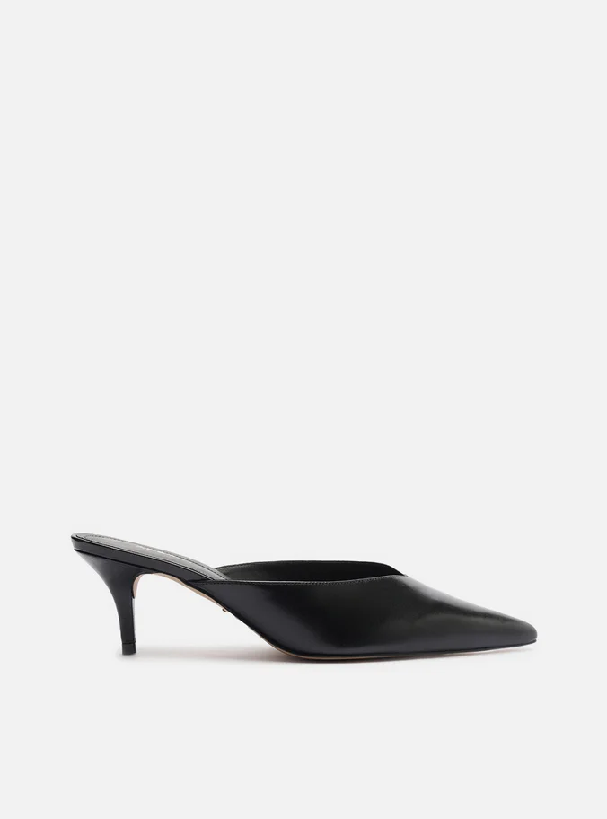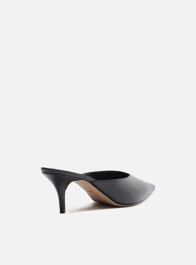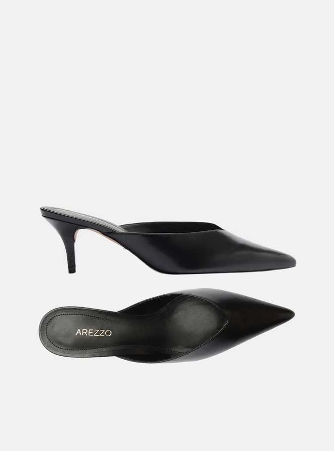 Mule feminina preta em couro com design minimalista e elegante. Conta com salto médio fino que alonga a silhueta, e bico fino que adiciona sofisticação ao visual. O cabedal fechado apresenta um charmoso recorte em V, trazendo modernidade e conforto para compor looks versáteis, do trabalho ao lazer.