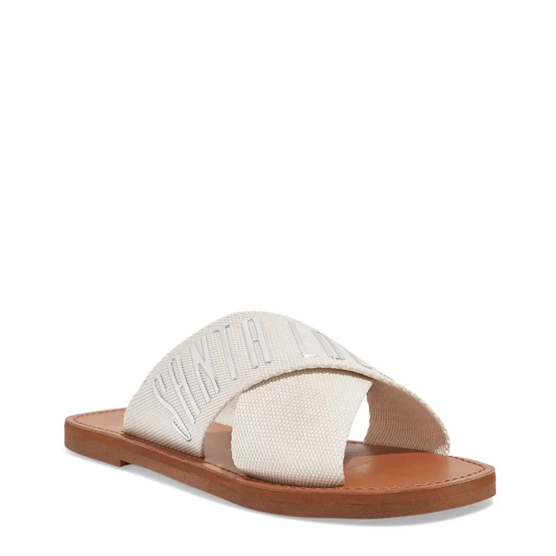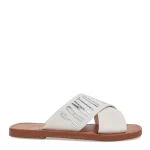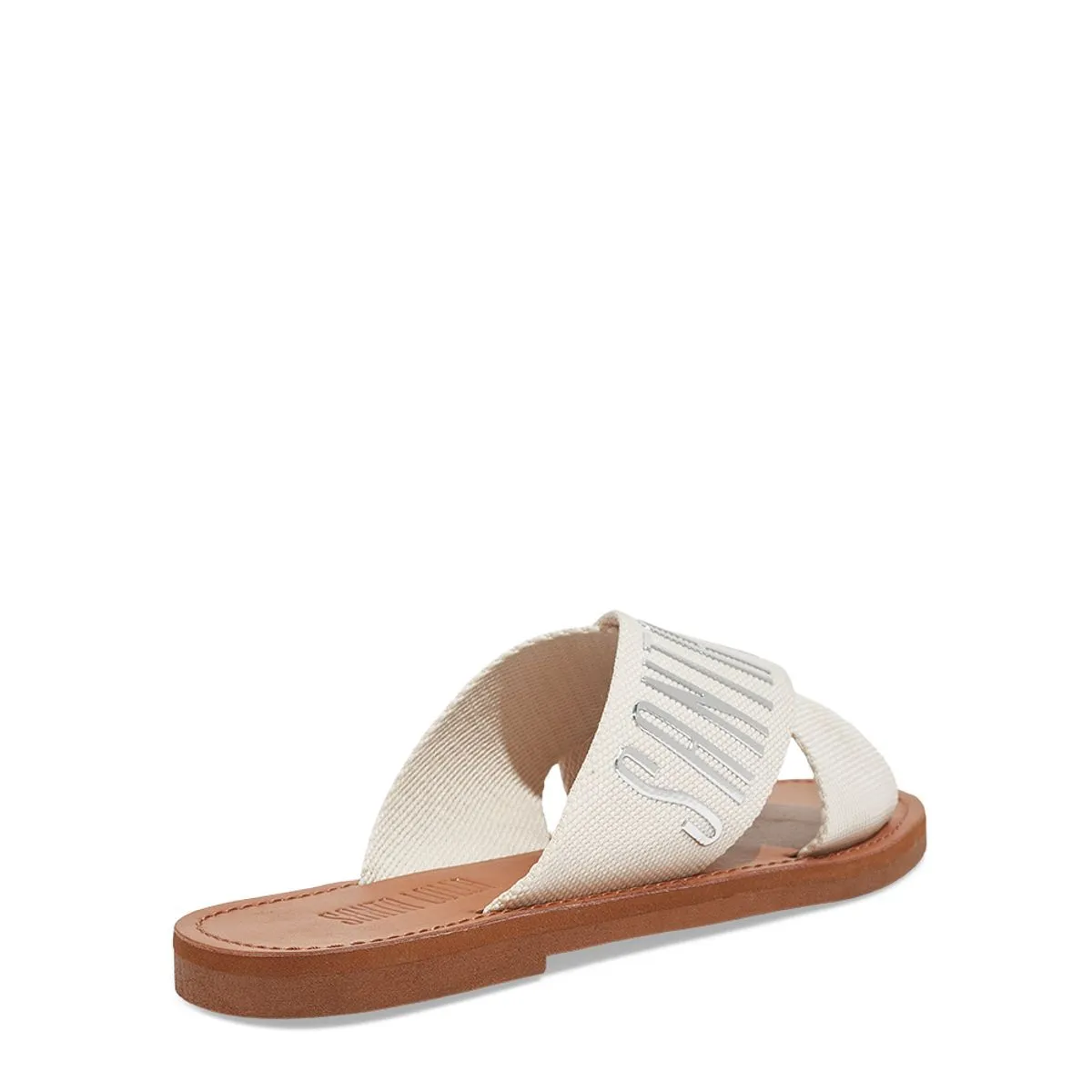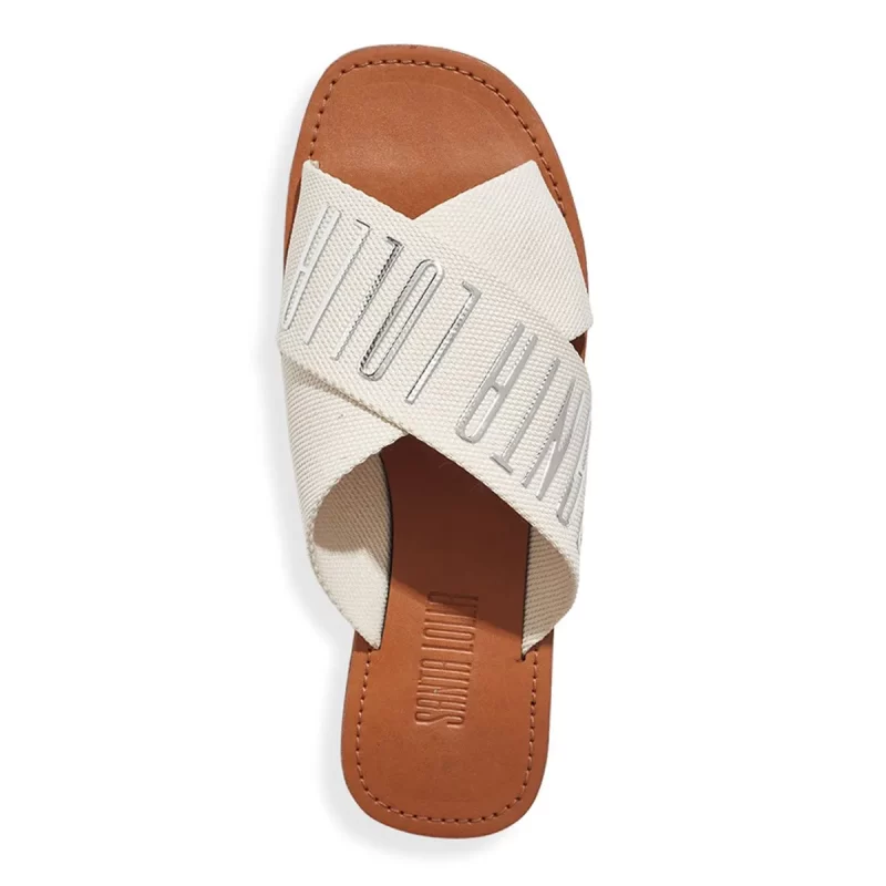 Rasteira Santa Lolla em gorgurão, o modelo apresenta tiras largas cruzadas em tecido gorgurão na cor Off – White, com logo da marca em prata trazendo um toque urbano e atual. O solado caramelo e o formato quadrado valorizam o design minimalista, deixando a peça versátil para diversas ocasiões.