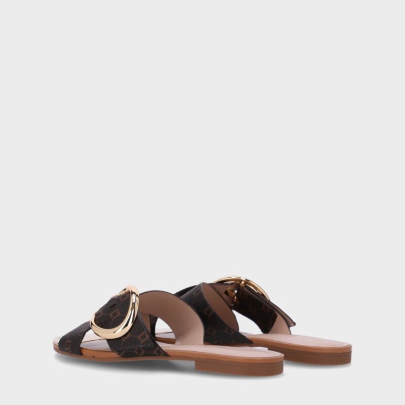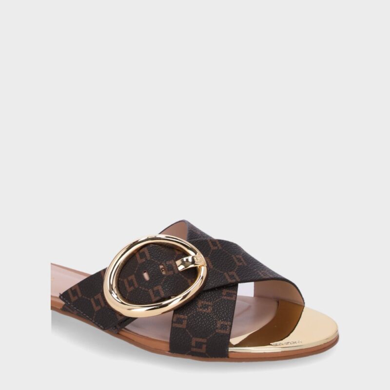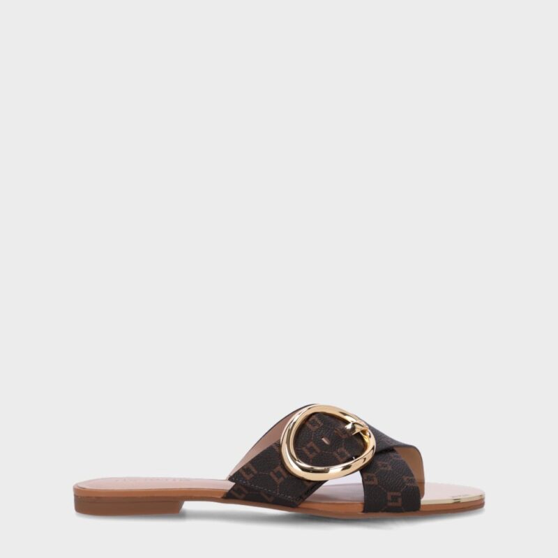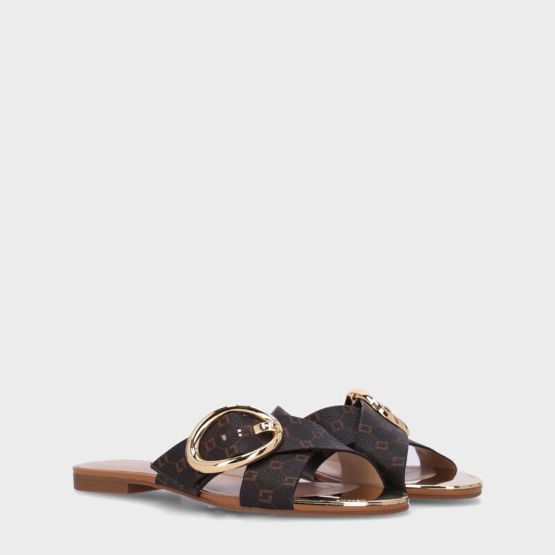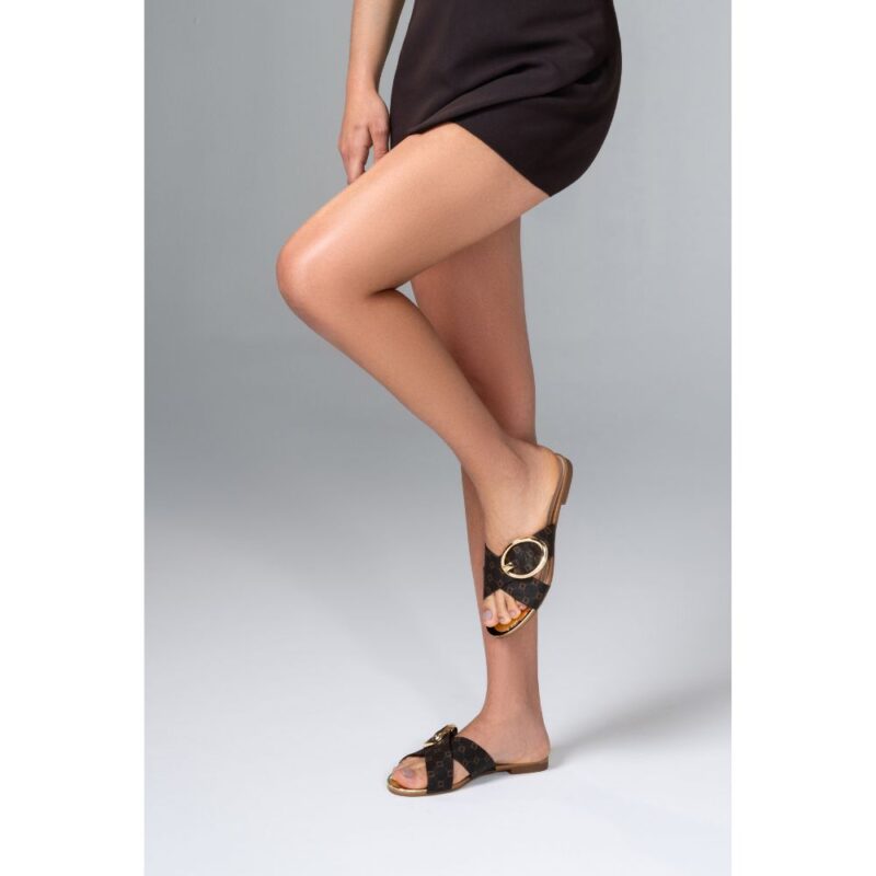 Com design moderno, o cabedal em monogramas exclusivo da marca valoriza o visual e garante elegância em qualquer ocasião. O destaque fica por conta da maxi fivela dourada , que adiciona charme e personalidade ao calçado.