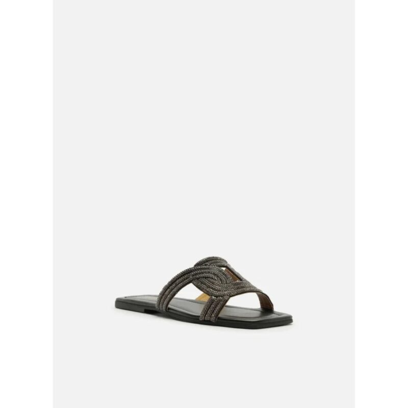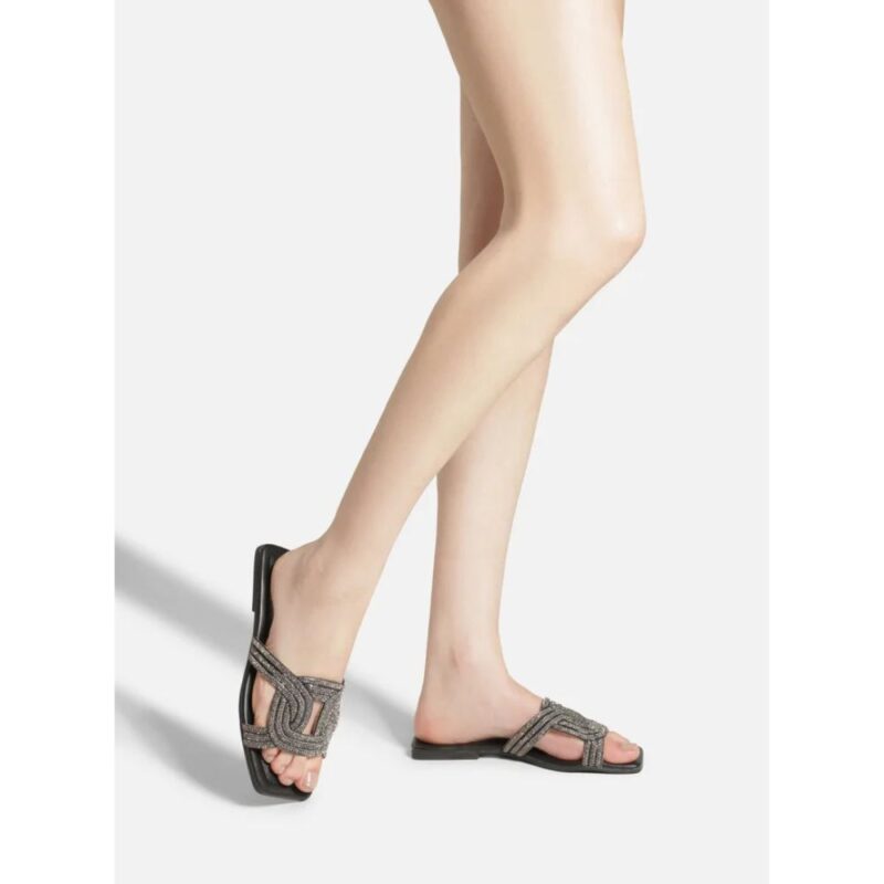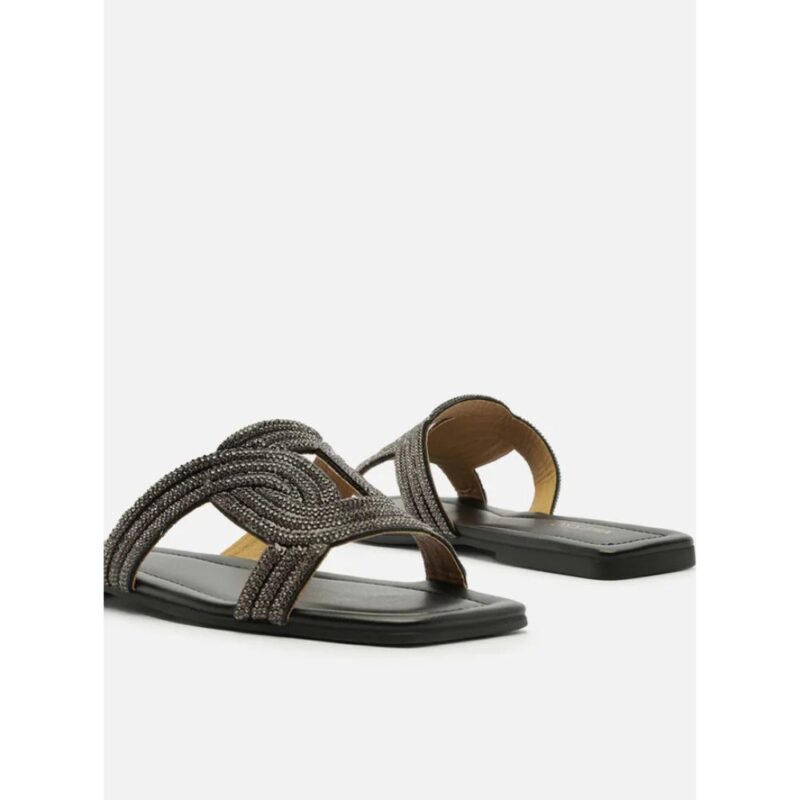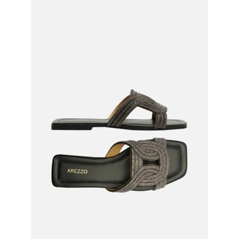 Prática de calçar e muito charmosa! A rasteira aposta no cabedal com strass e garante brilho e conforto para suas produções.