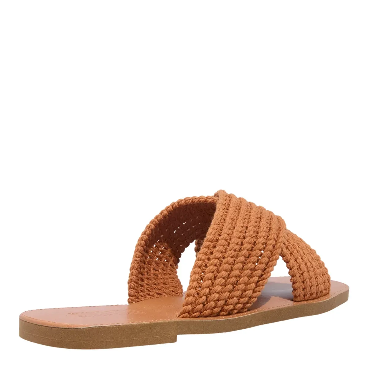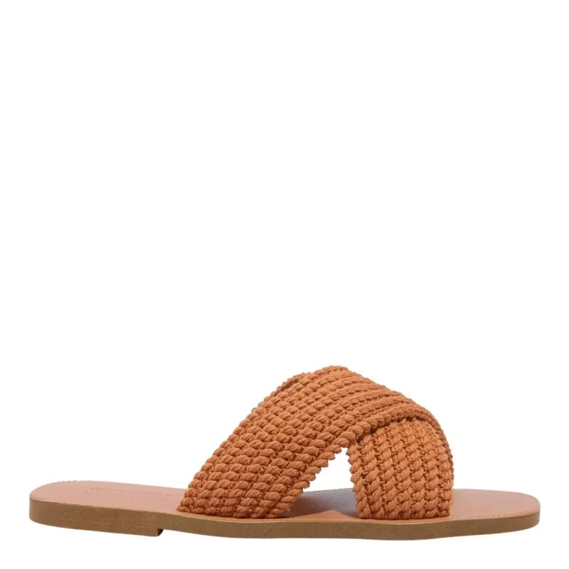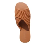 O modelo apresenta tiras largas trançadas em textura rustica, criando um efeito artesanal que valoriza qualquer look. A palmilha em tom caramelo reforça a estética leve e sofisticada, enquanto o bico quadrado deixa a peça mais contemporânea e estilosa.