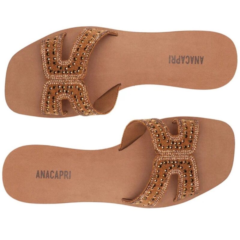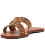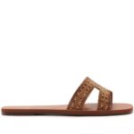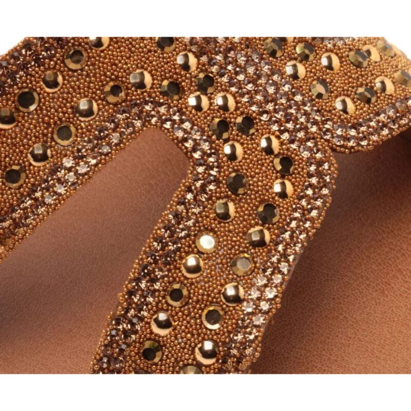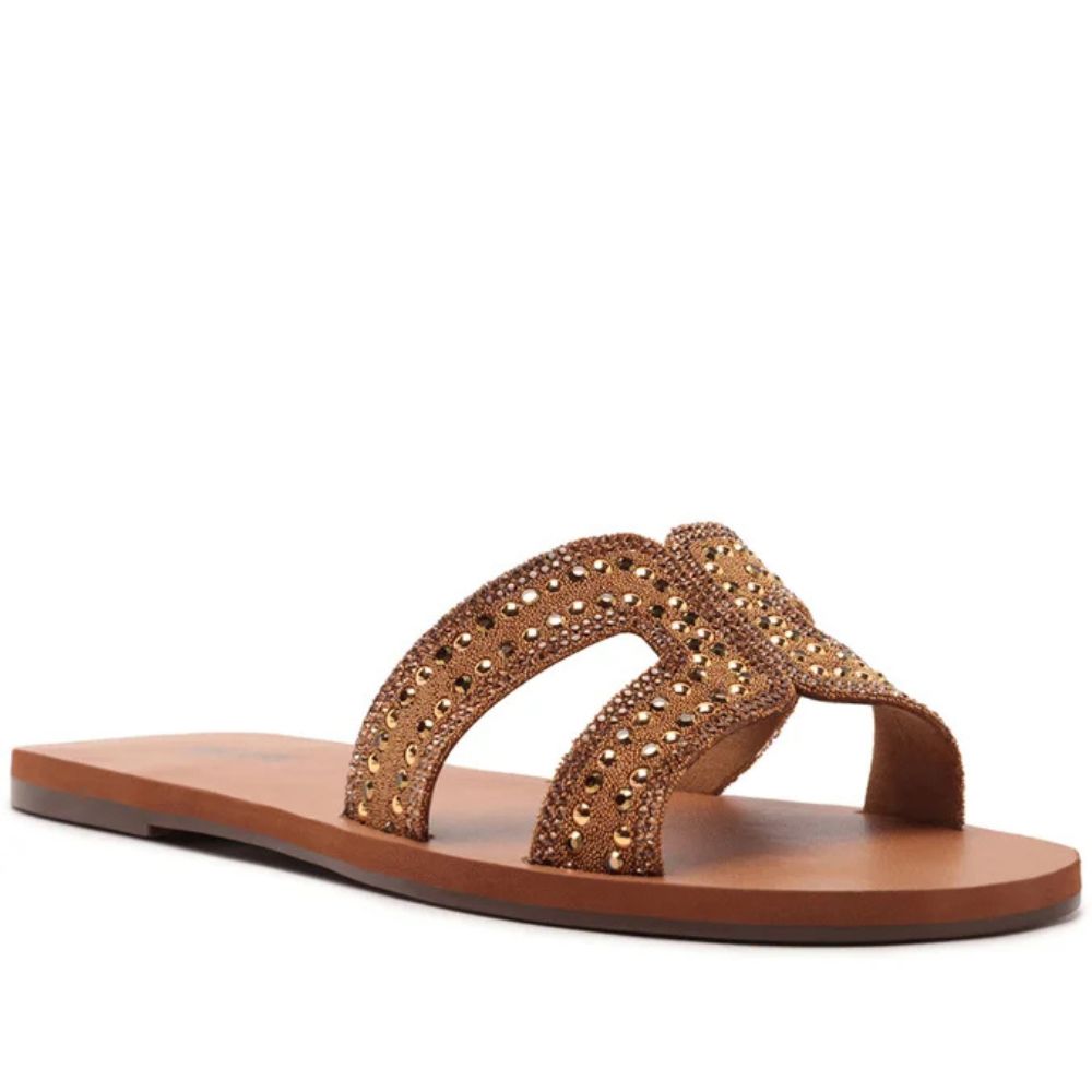 Rasteira com tira em H e aplicação de strass, na cor marrom gold. O modelo apresenta cabedal em tira geométrica vazada: uma tira única mais larga, com design de recortes em H sobre a gáspea, com aplicação strass em tamanhos diversos.