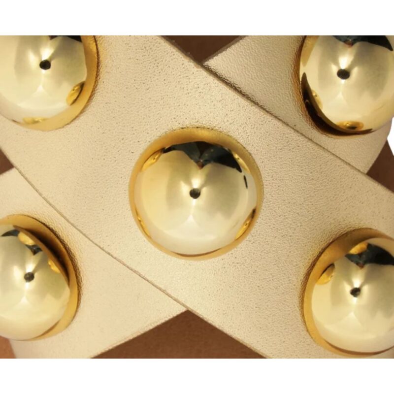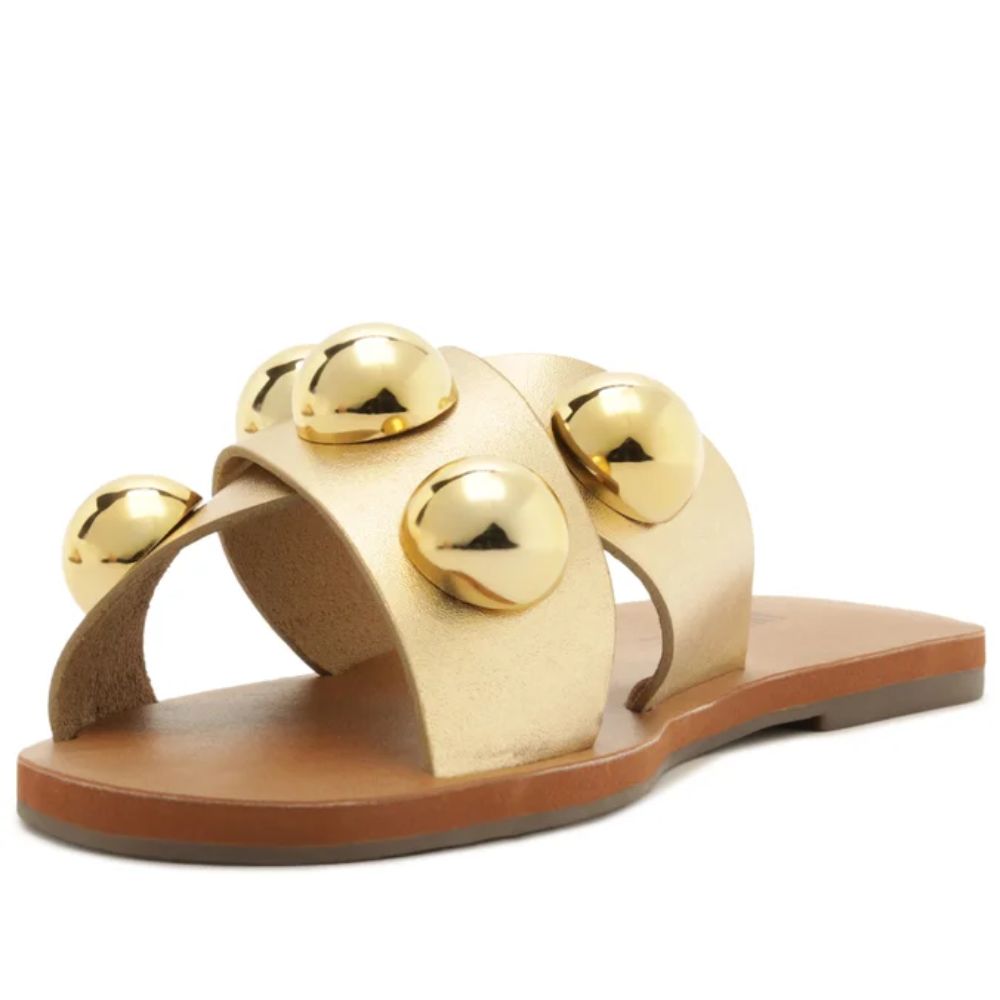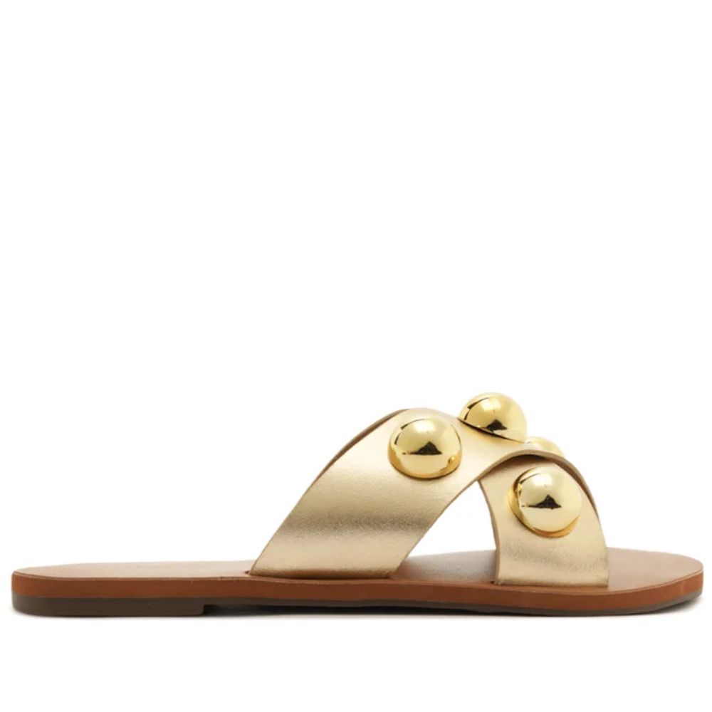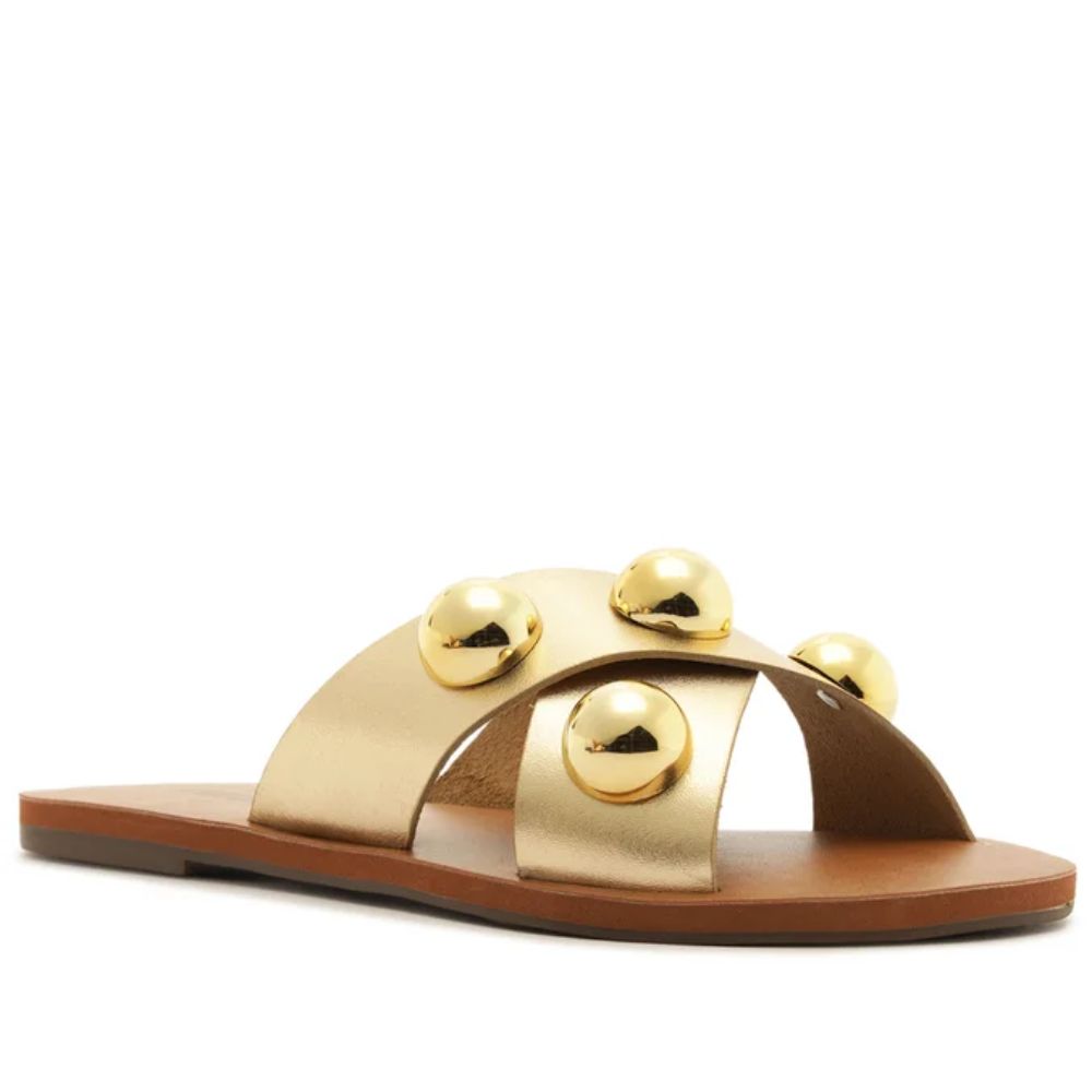 A Rasteira Anacapri traz um visual moderno e marcante com suas tiras cruzadas em couro, que garantem conforto e perfeito encaixe dos pés. o destaque absoluto fica por conta dos adornos metálicos dourados, em formato abaloado, que adicionam brilho, personalidade e um toque fashion.