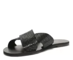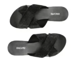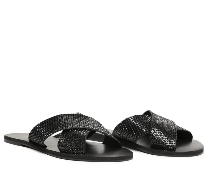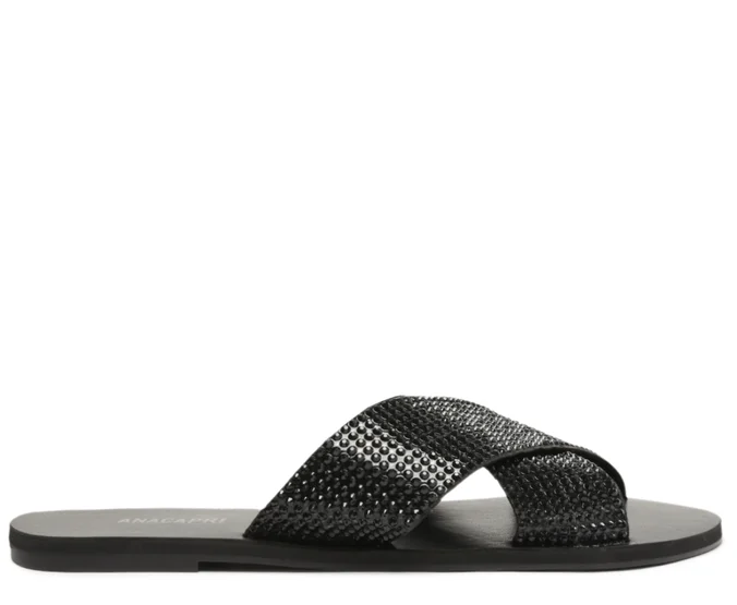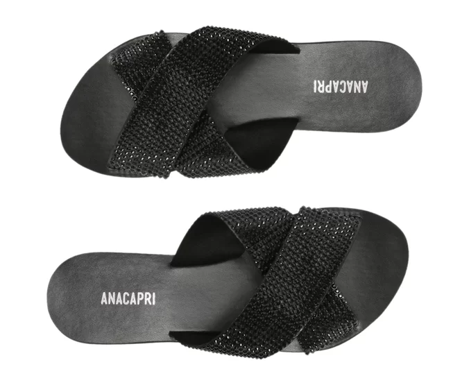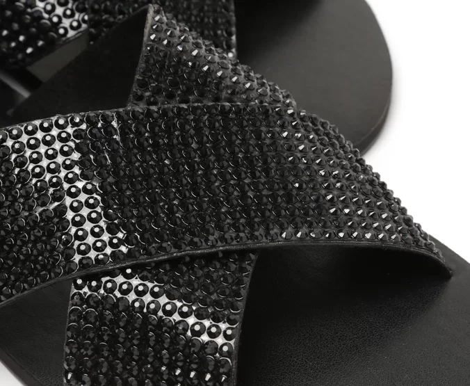 Rasteira preta Anacapri com tiras cruzadas em strass. Brilho, conforto e estilo para arrasar no look com praticidade e leveza.