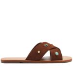 Rasteira de tiras cruzadas, em couro acamurçado, na cor marrom. O modelo possui solado emborrachado marrom, com leve saltinho traseiro. Apresenta cabedal em duas tiras de couro acamurçado mais largas, com detalhe para aplicação de pins redondos com pedrarias e outros menores metálicos, espalhados por toda a peça. As tiras se cruzam em X sobre os dedos e o peito de pé.