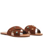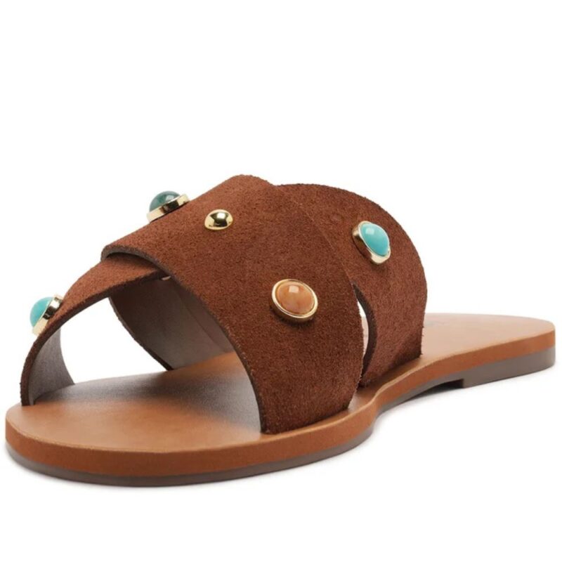 Rasteira de tiras cruzadas, em couro acamurçado, na cor marrom,  e em pins metálicos com pedrarias modernas, deixando a peça mais leve.