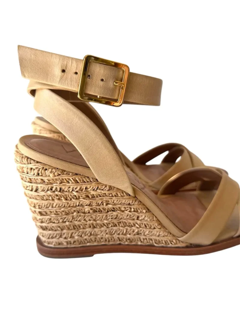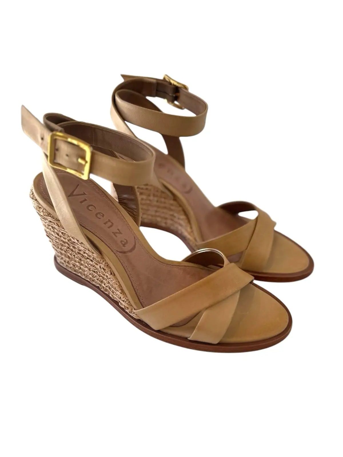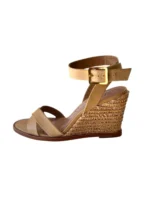 A Sandália Anabela Tiras Cruzadas da Vicenza combina design contemporâneo com um toque natural e sofisticado. Seu material multimaterial nas cores palha natural e nude cria uma peça versátil e fácil de combinar.
