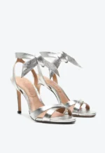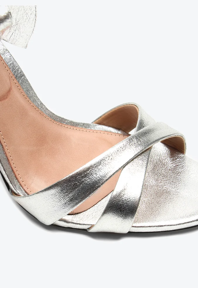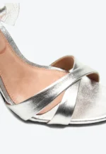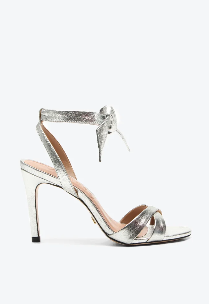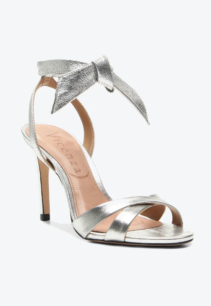 Sandália Vicenza prata em couro com salto alto de 7 cm e amarração em laço. Charmosa e delicada, perfeita para looks sofisticados.