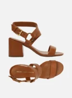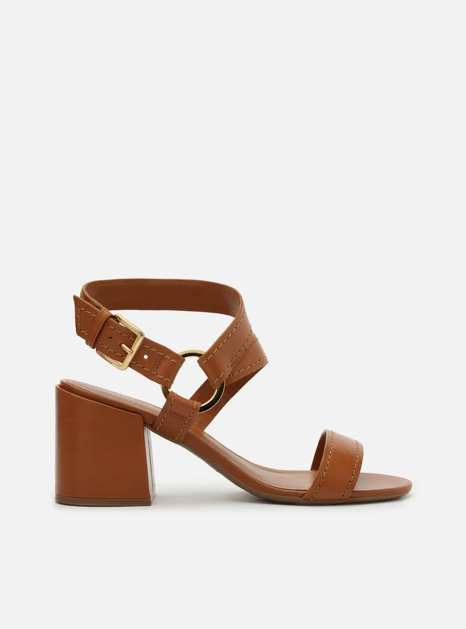 O destaque fica por conta das tiras largas com pespontos, posicionadas sobre os dedos, lateral do pé, calcanhar e tornozelo, todas conectadas por uma argola metálica, que adiciona um toque moderno e sofisticado ao visual. O fecho em fivela garante ajuste seguro e praticidade.