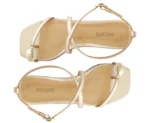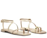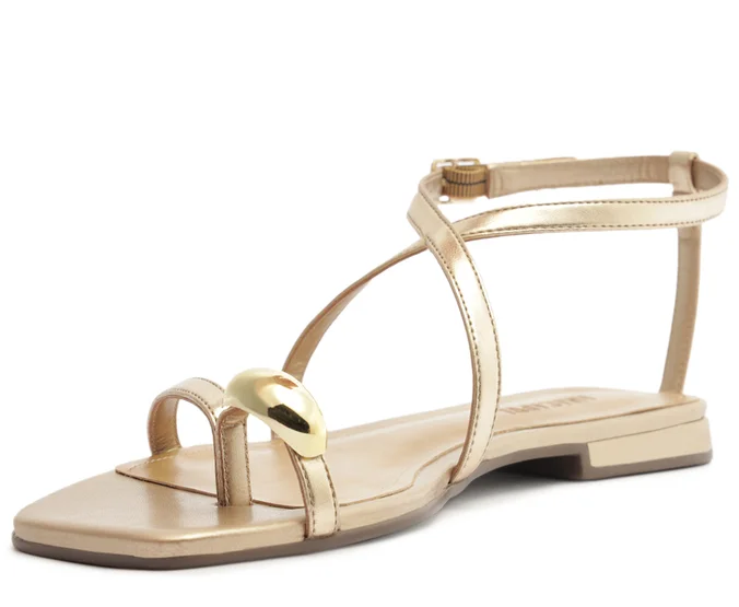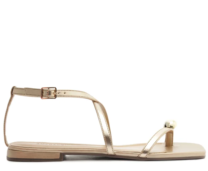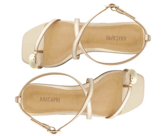 A Sandália Minimal Doots Dourada da Anacapri apresenta um design elegante e moderno, com biqueira quadrada que valoriza o estilo minimalista. O cabedal traz uma tirinha diagonal que separa os dedos, adornada com um maxi detalhe redondo metálico sobre o dedão, adicionando charme e exclusividade.