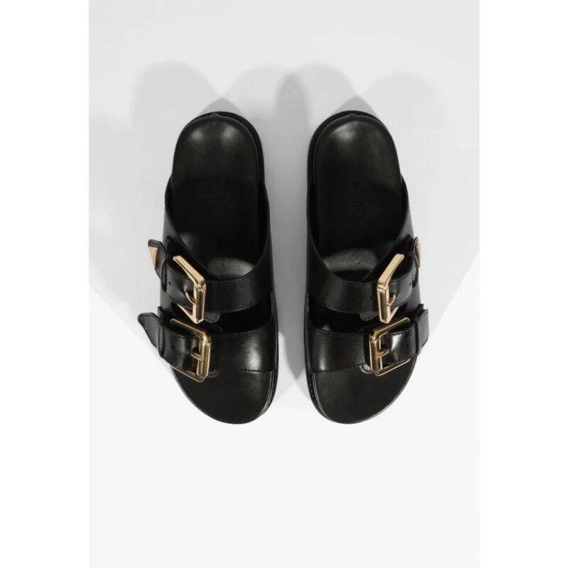 A Papete Aurora Schutz é sinônimo de conforto aliado ao estilo moderno. Com design robusto e elegante, ela traz o couro legitimo como protagonista, garantindo durabilidade e um visual sofisticado.. As maxi fivelas douradas adicionam um toque de rilho e personalidade ao modelo, equilibrando perfeitamente o ar despojado da papete com elegância característica da Schutz.