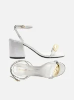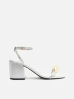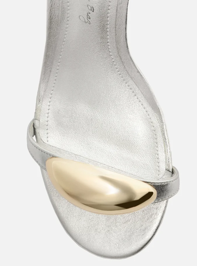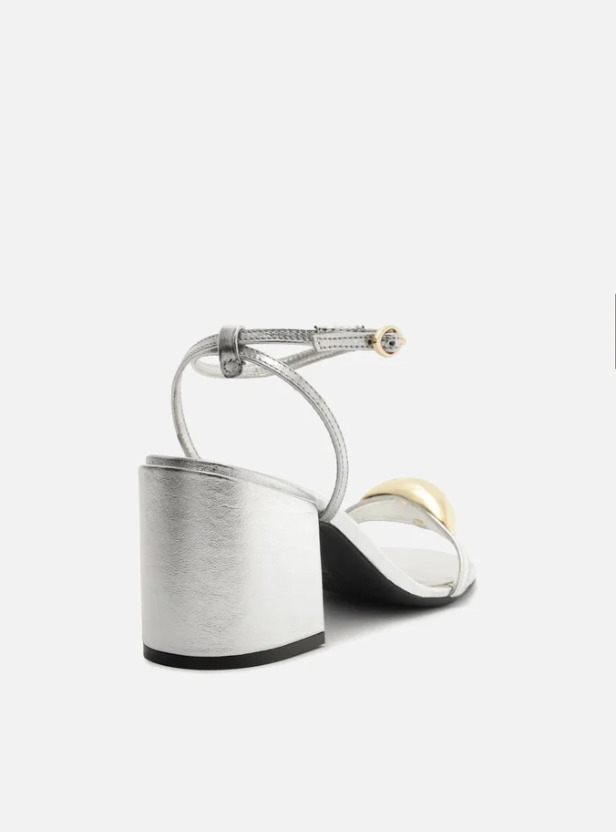 Descrição: Sandália prateada de couro. O sapato tem salto médio bloco e formato arredondado na ponta. Traz tira sobre os dedos com aplicação de metal dourado, espesso e orgânico. Possui tira fina que sai das laterais, se cruza no calcanhar, contorna o tornozelo e fecha em fivela lateral. Com palmilha da cor da sandália. A sandália exibe todo o pé.