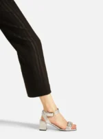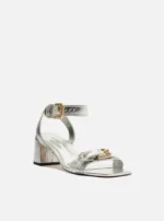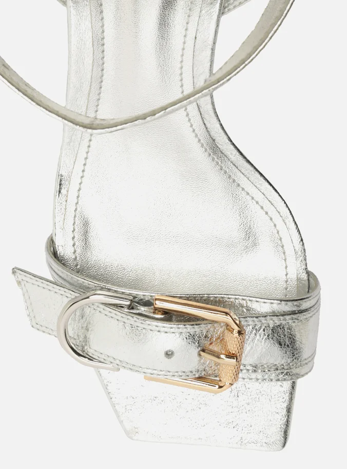 Sandália prata em couro com salto bloco médio e bico quadrado. Detalhes em fivelas douradas trazem elegância e estilo refinado para seu look.
