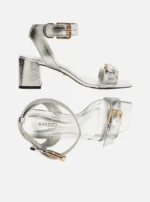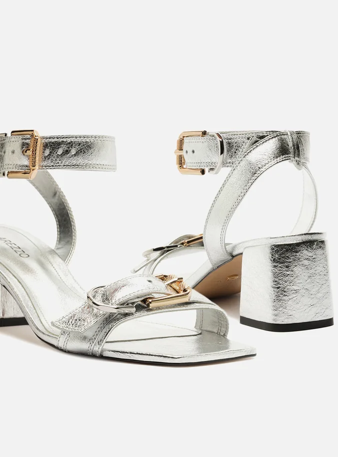 Sandália Arezzo Prata Couro Salto Bloco Médio Fivelas