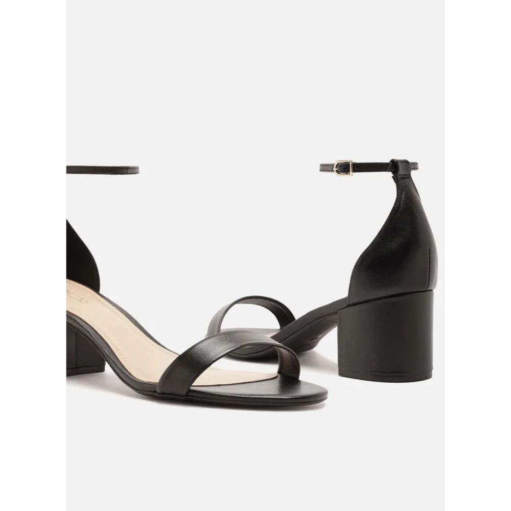 Sandália Preta de couro. O modelo tem salto médio bloco e bico redondo. Traz tira média sobre os dedos. Fechada no calcanhar, possui tira fina no tornozelo com fivela metálica lateral.