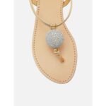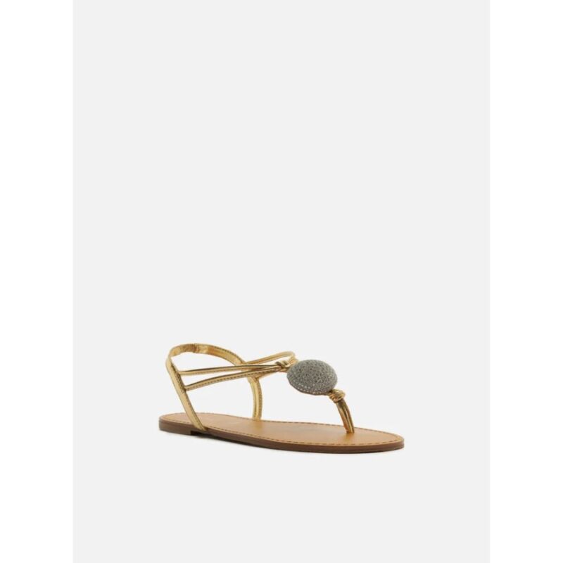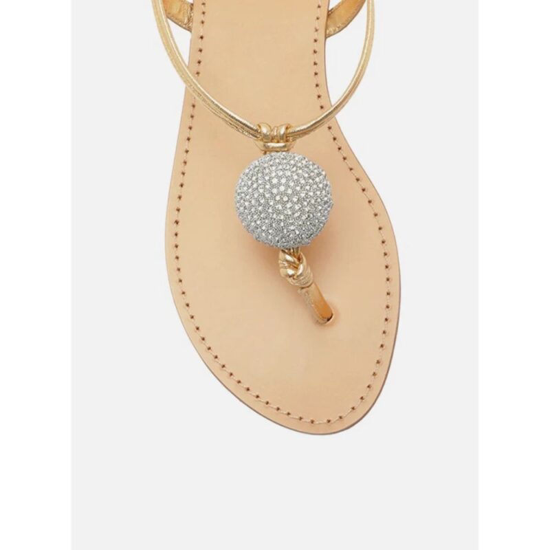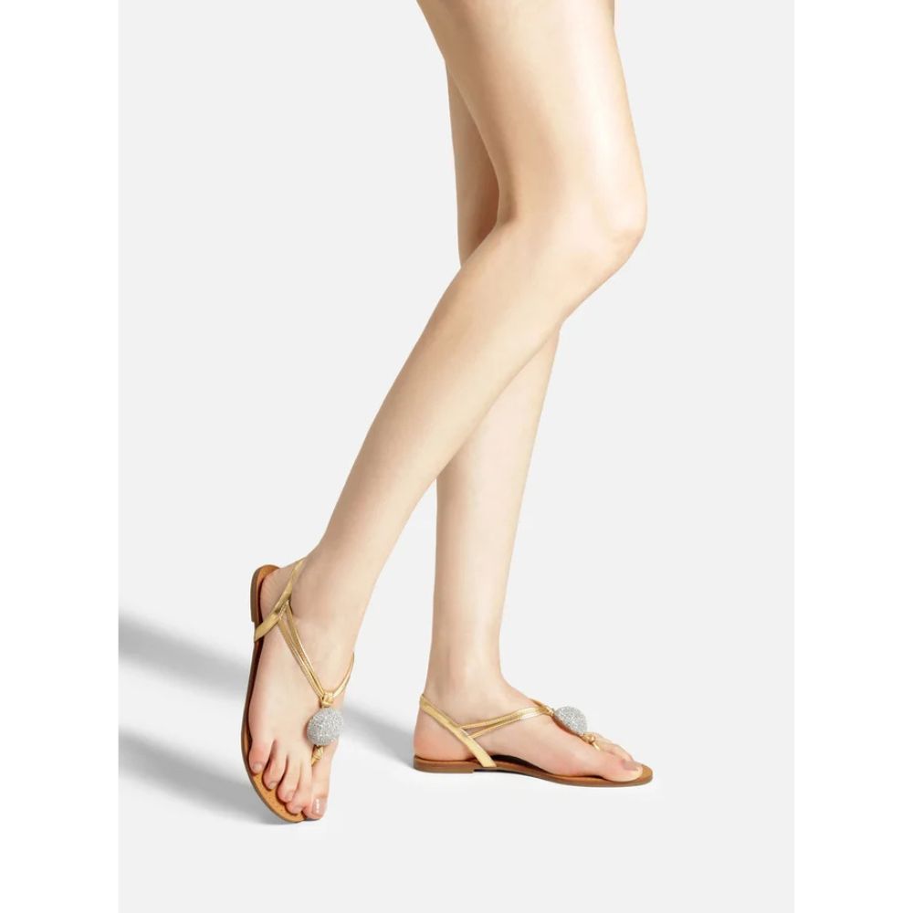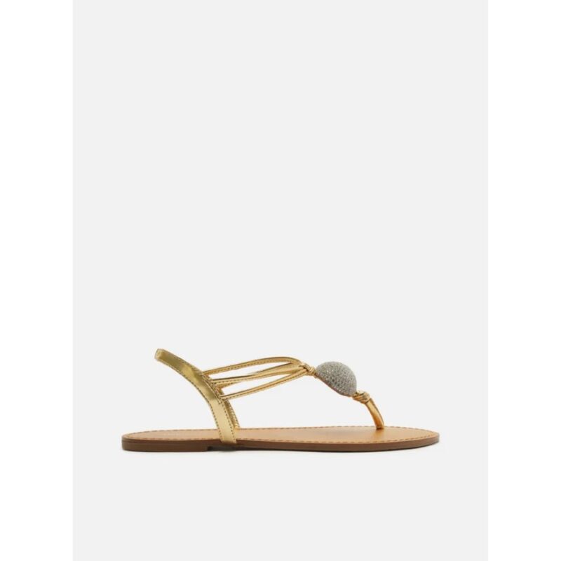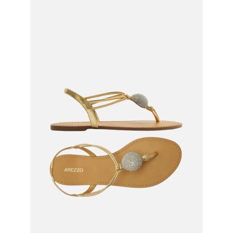 Sandália rasteira feminina dourada. Tem sola flat e formato arredondado na ponta. Traz tira fina que passa entre os dedos, com aplicação de peça redonda com cristais, conectada a mais uma tira fina dupla na horizontal.