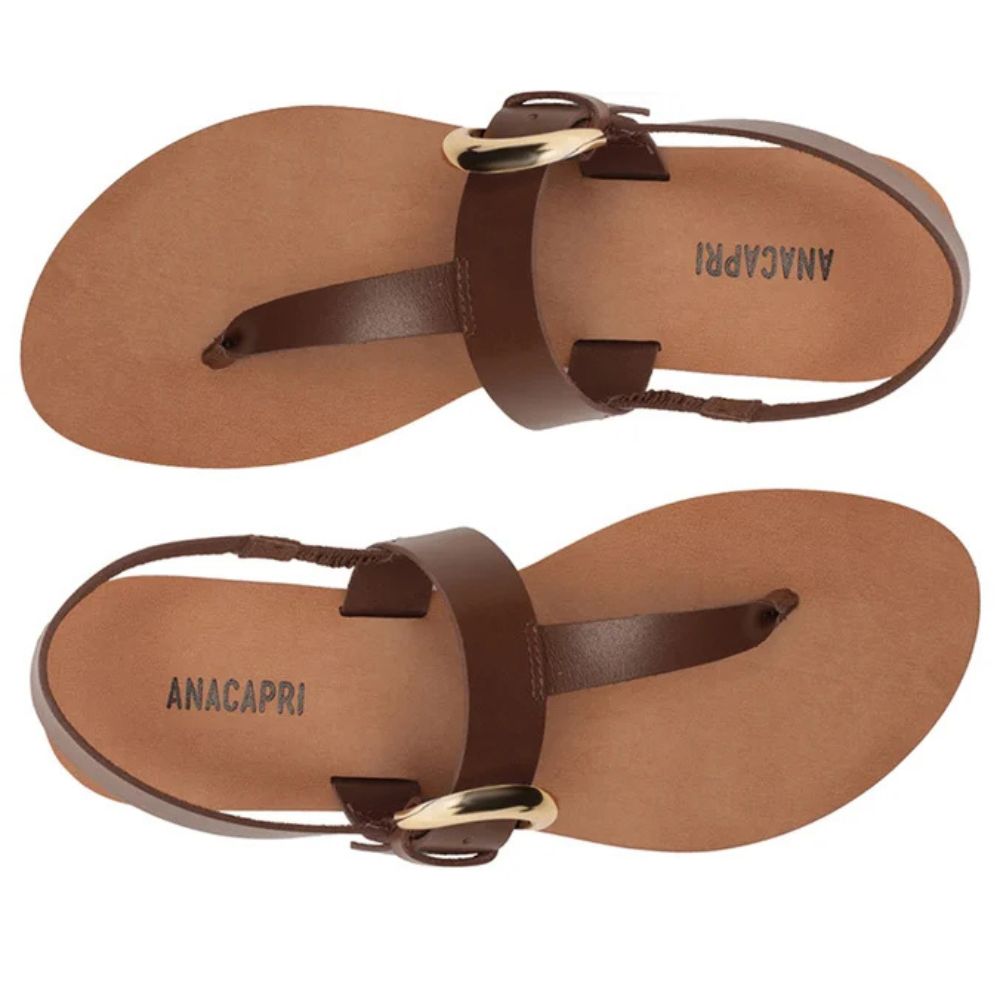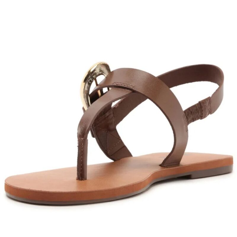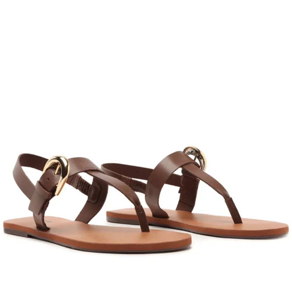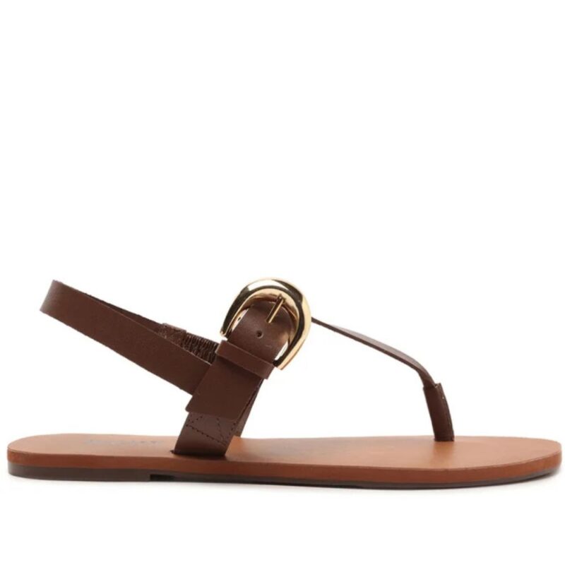 Sandália rasteira com detalhe em fivela, na cor marrom. O modelo com shape slim possui sola rasteira flat emborrachada, com leve saltinho traseiro. Com biqueira arredondada, traz cabedal com tira fina central que passa entre os dedos, que se conecta na tira mais larga, no peito do pé, com fecho lateral por maxi fivela metálica