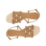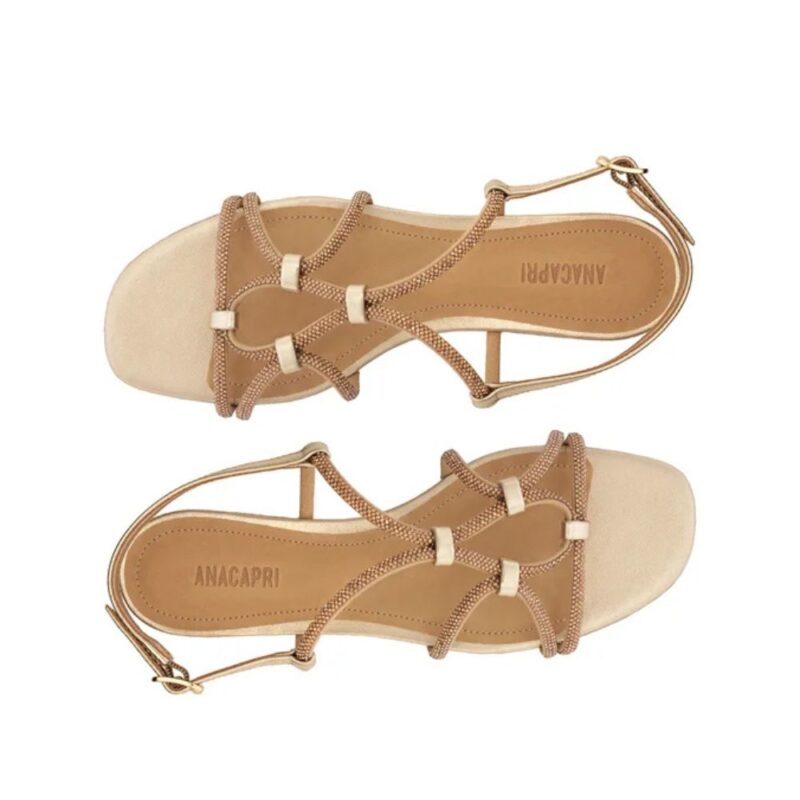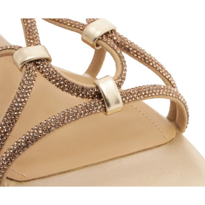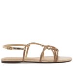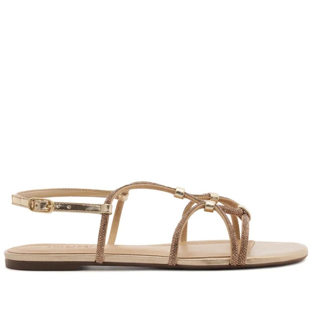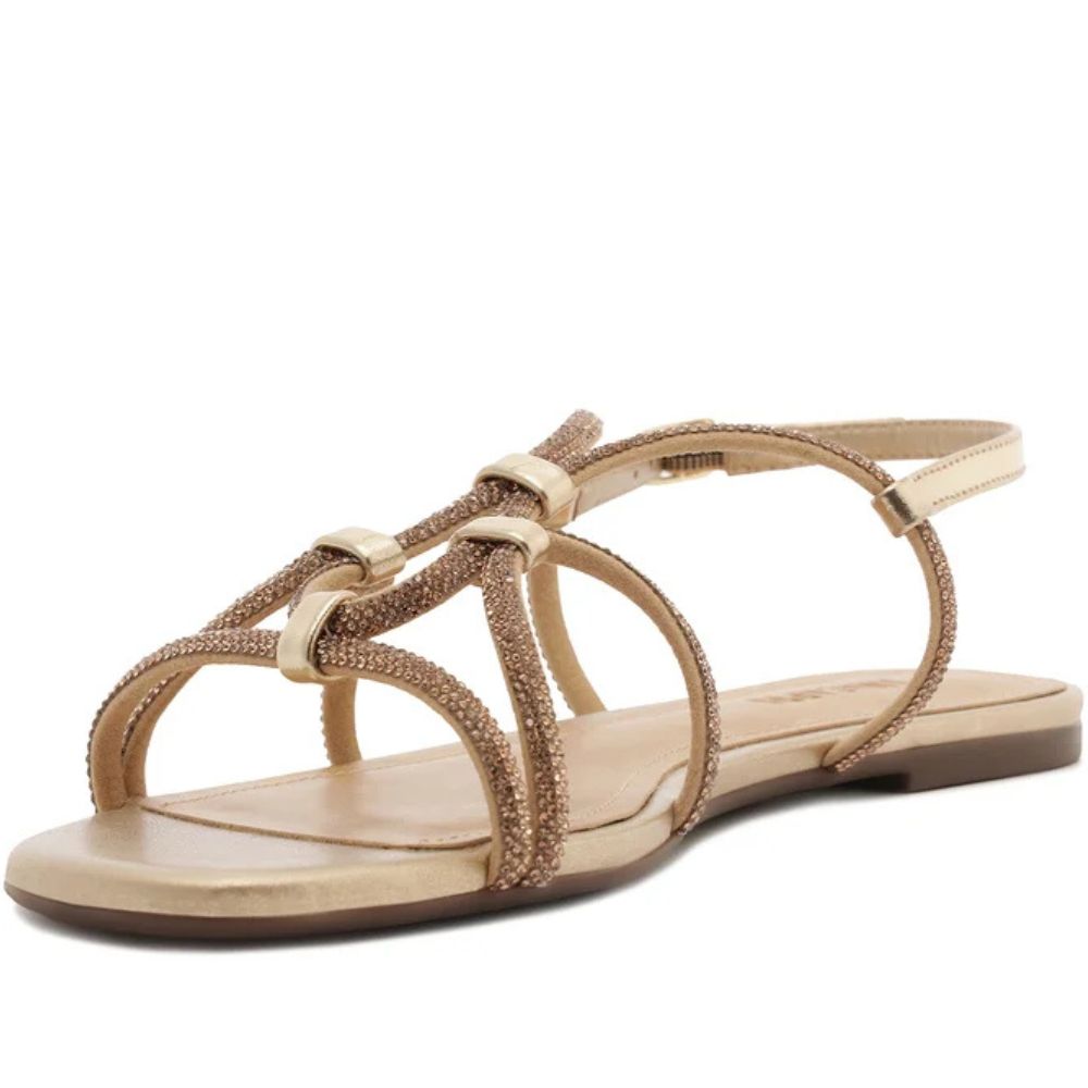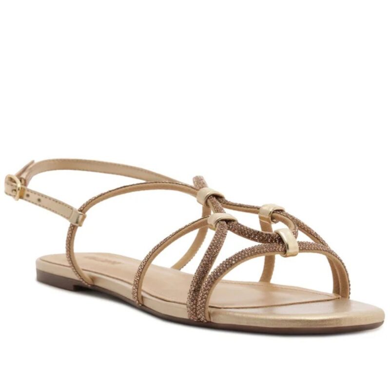 Sandália rasteira de multi tiras glam, com adorno metálico, na cor dourada. O modelo com detalhe glam em manta brilhosa apresenta cabedal com design vazado e imponente, com tiras bombadas, presas por tachas metálicas que se unem na parte central da peça.