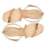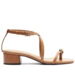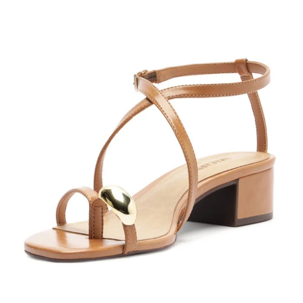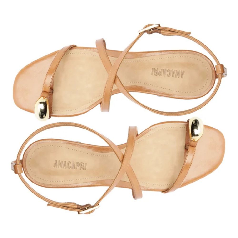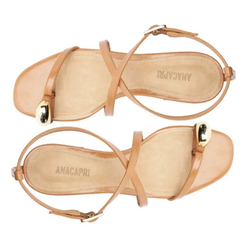 Sandália de tiras e salto bloco, com detalhe em adorno, na cor marrom. O modelo apresenta salto em bloco médio. De biqueira quadrada, traz cabedal com tirinha em diagonal que separa os dedos, com aplicação de maxi adorno redondo e metálico sobre o dedão. Apresenta duas tiras que se cruzam sobre o peito de pé e contorna o tornozelo com fecho afivelado latera.