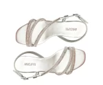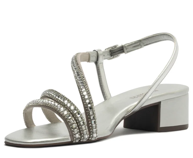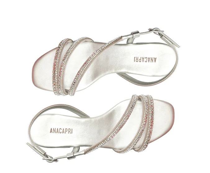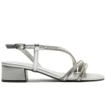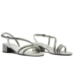Sandália de salto bloco com tira curva e aplicação de cristais, na cor prata. O modelo tem efeito metalizado, possui salto em bloco médio e biqueira moderna quadrada. Com cabedal em tirinhas em suede soft, com aplicação de manta brilhosa em cristais.