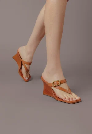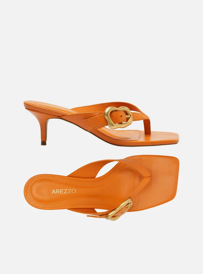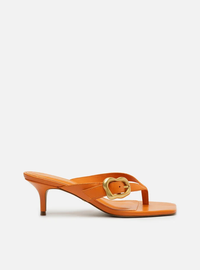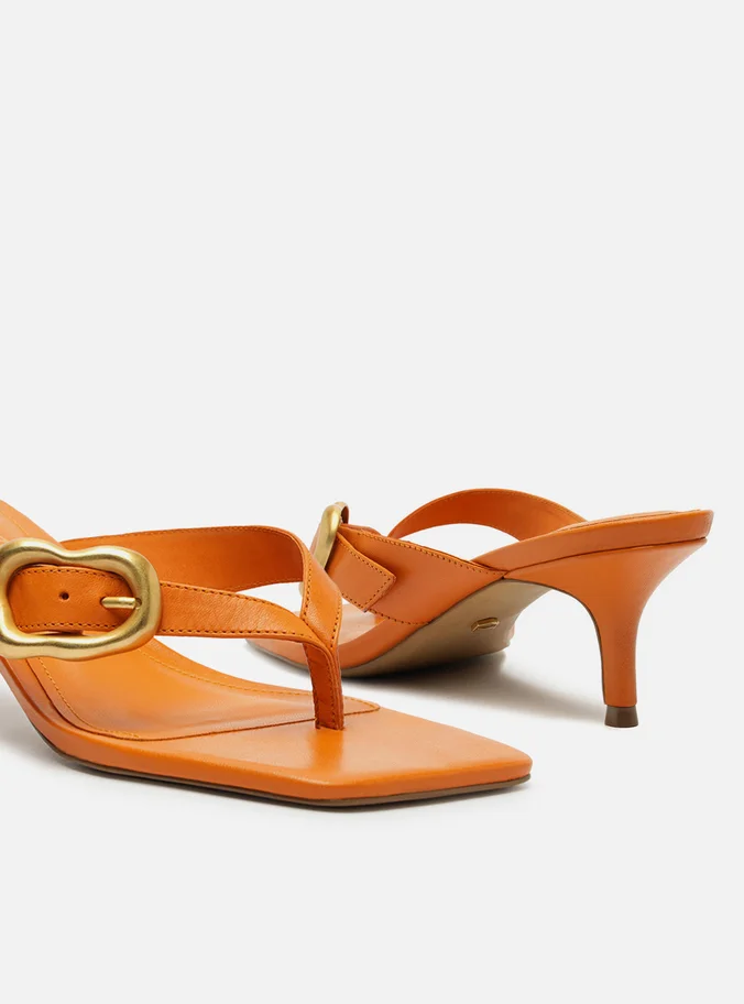 Descrição: Sandália feminina laranja de couro. O sapato tem salto médio fino e formato quadrado na ponta. Traz tiras dividindo os dedos e com fivela metálica dourada, escovada e em formato orgânico em uma das laterais. Com palmilha da cor da sandália e nome da marca. A sandália exibe todo o pé.