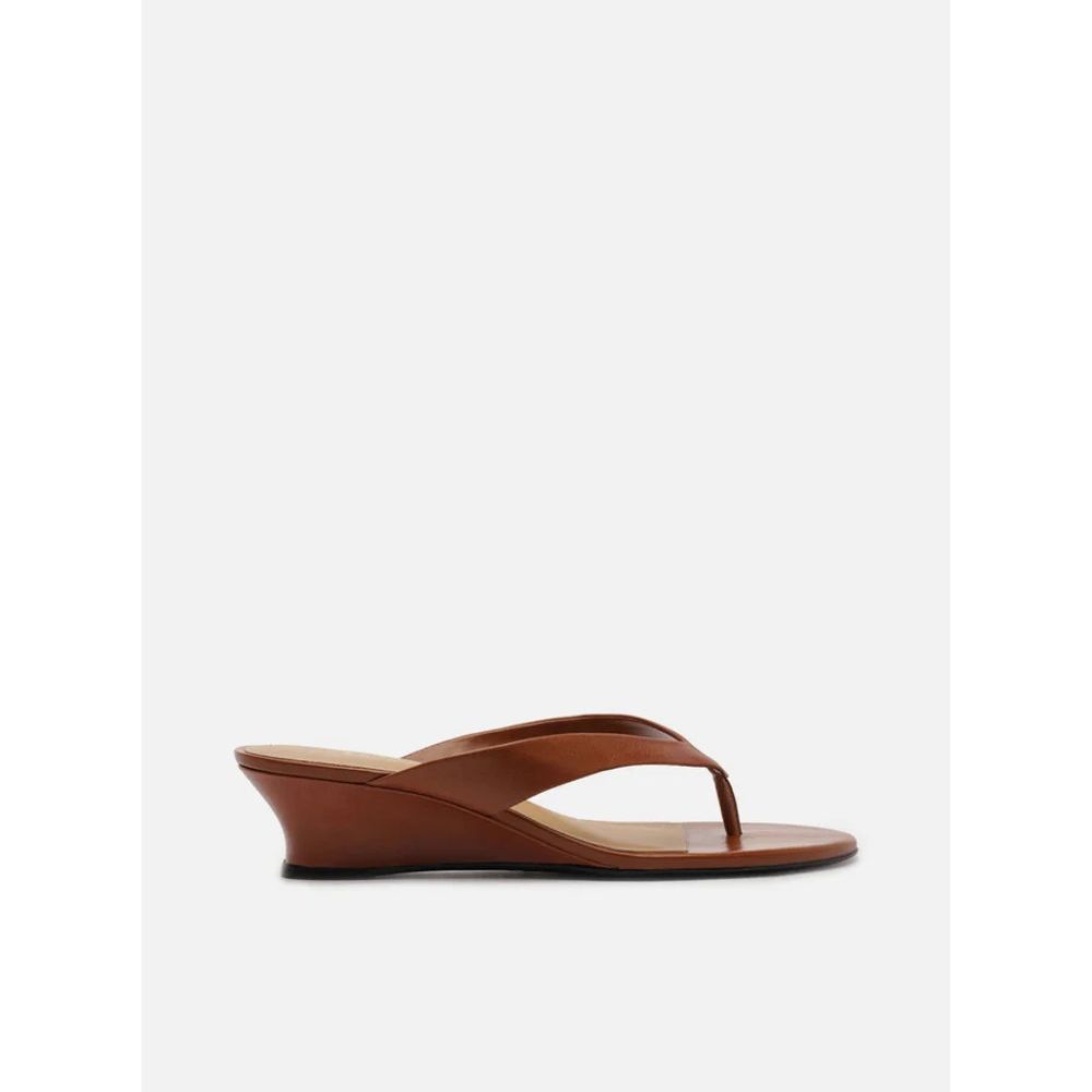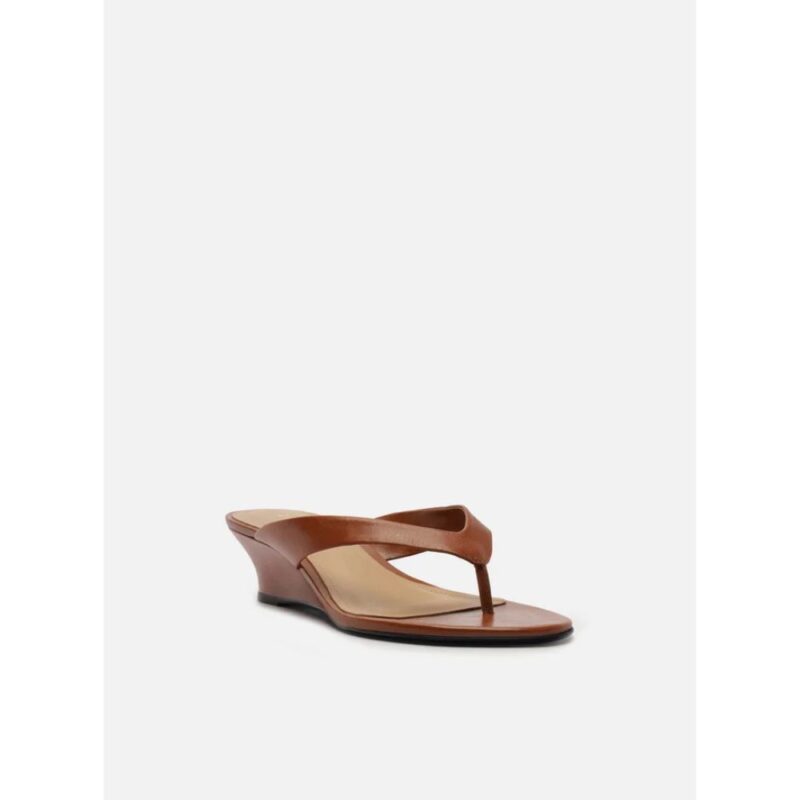 Sandália marrom de couro. O sapato tem salto baixo anabela e formato arredondado na ponta. Traz tira larga dividindo os dedos.